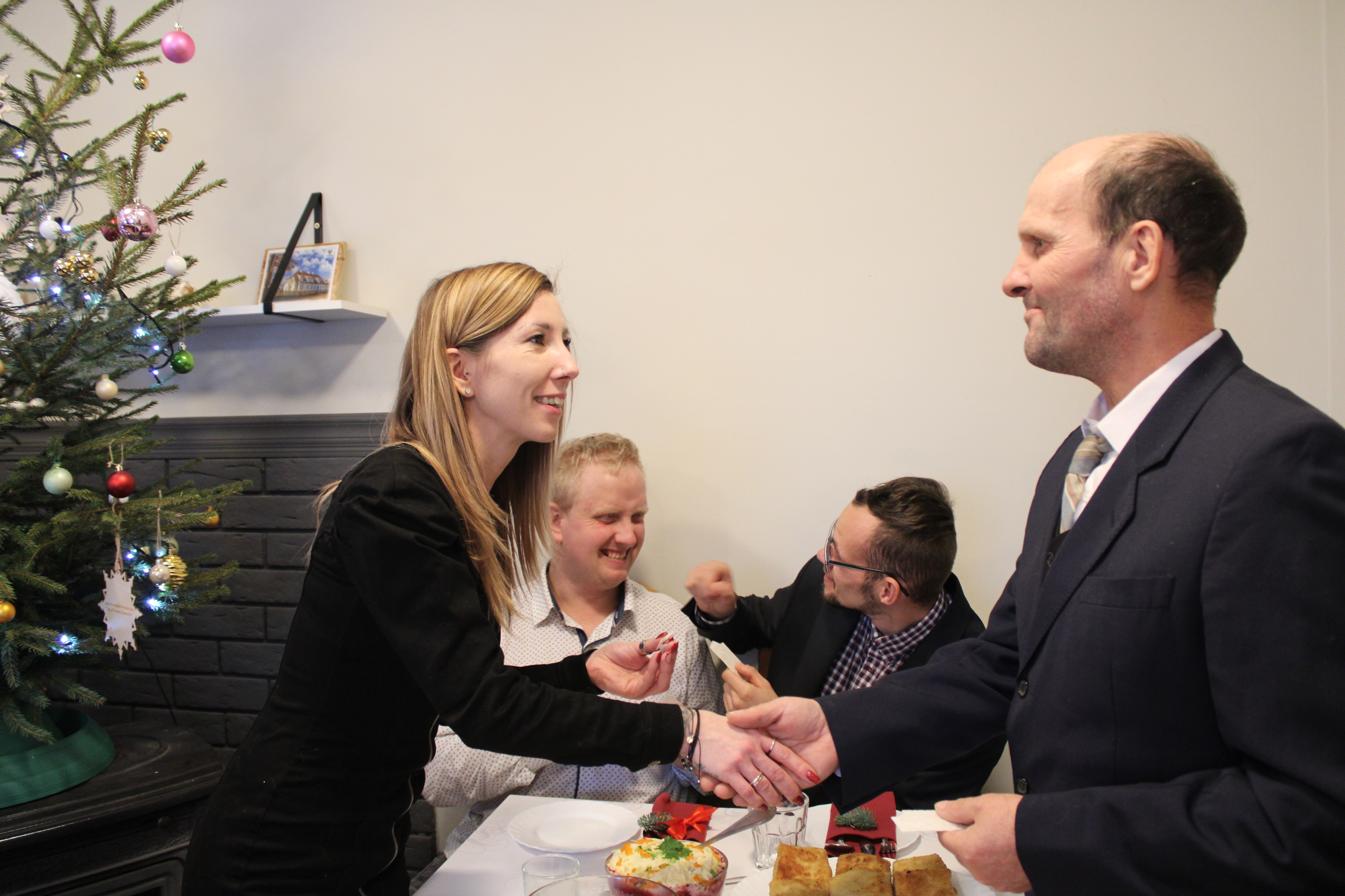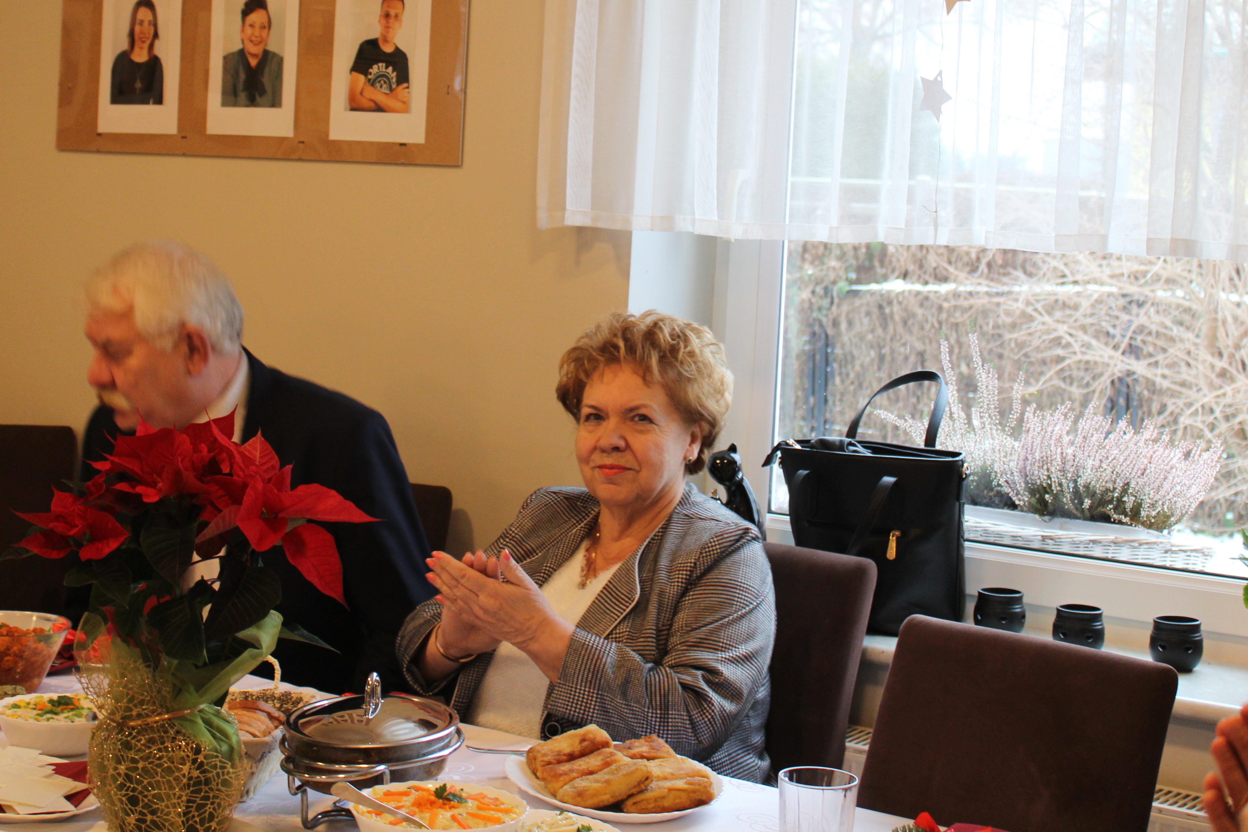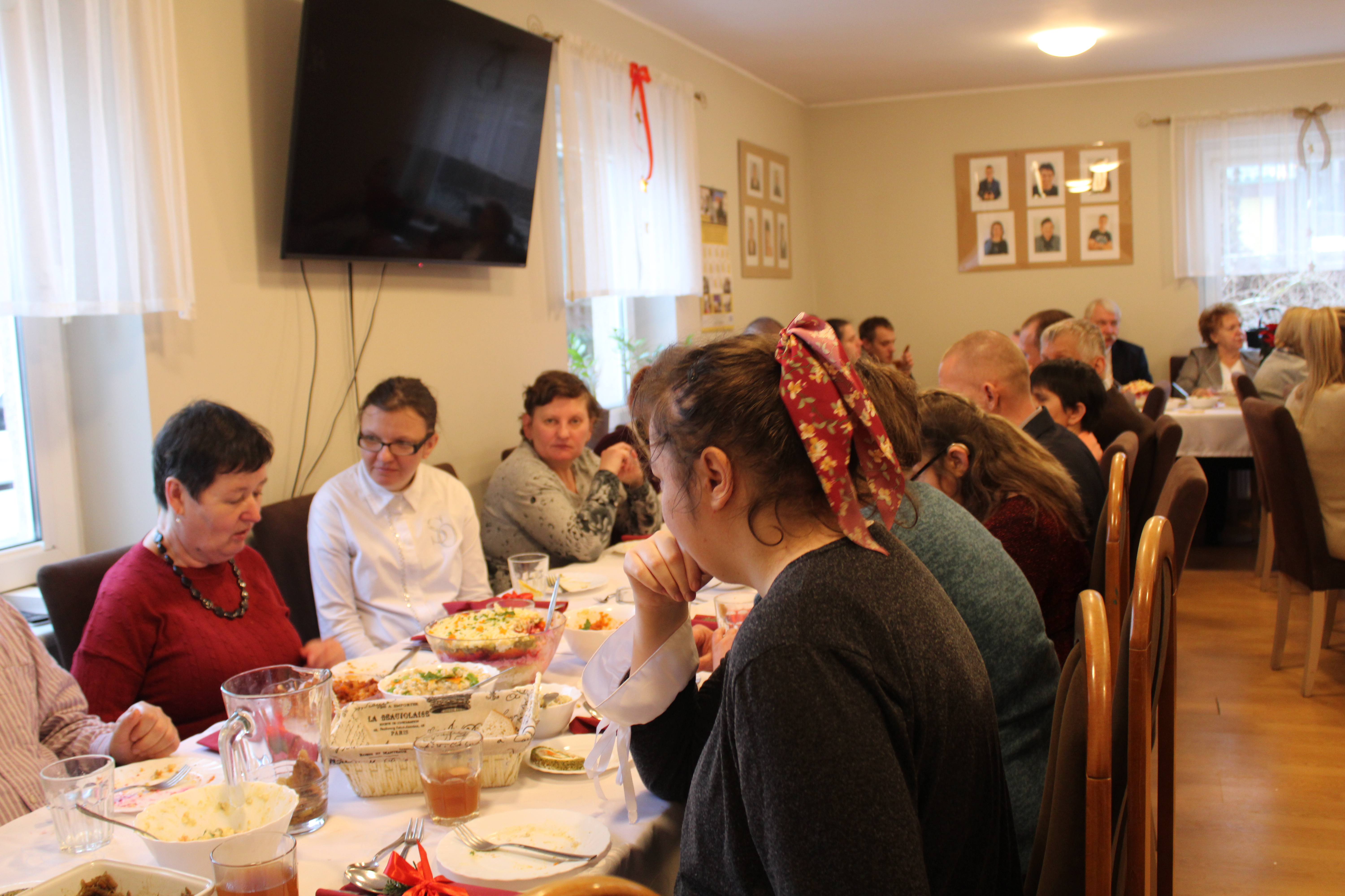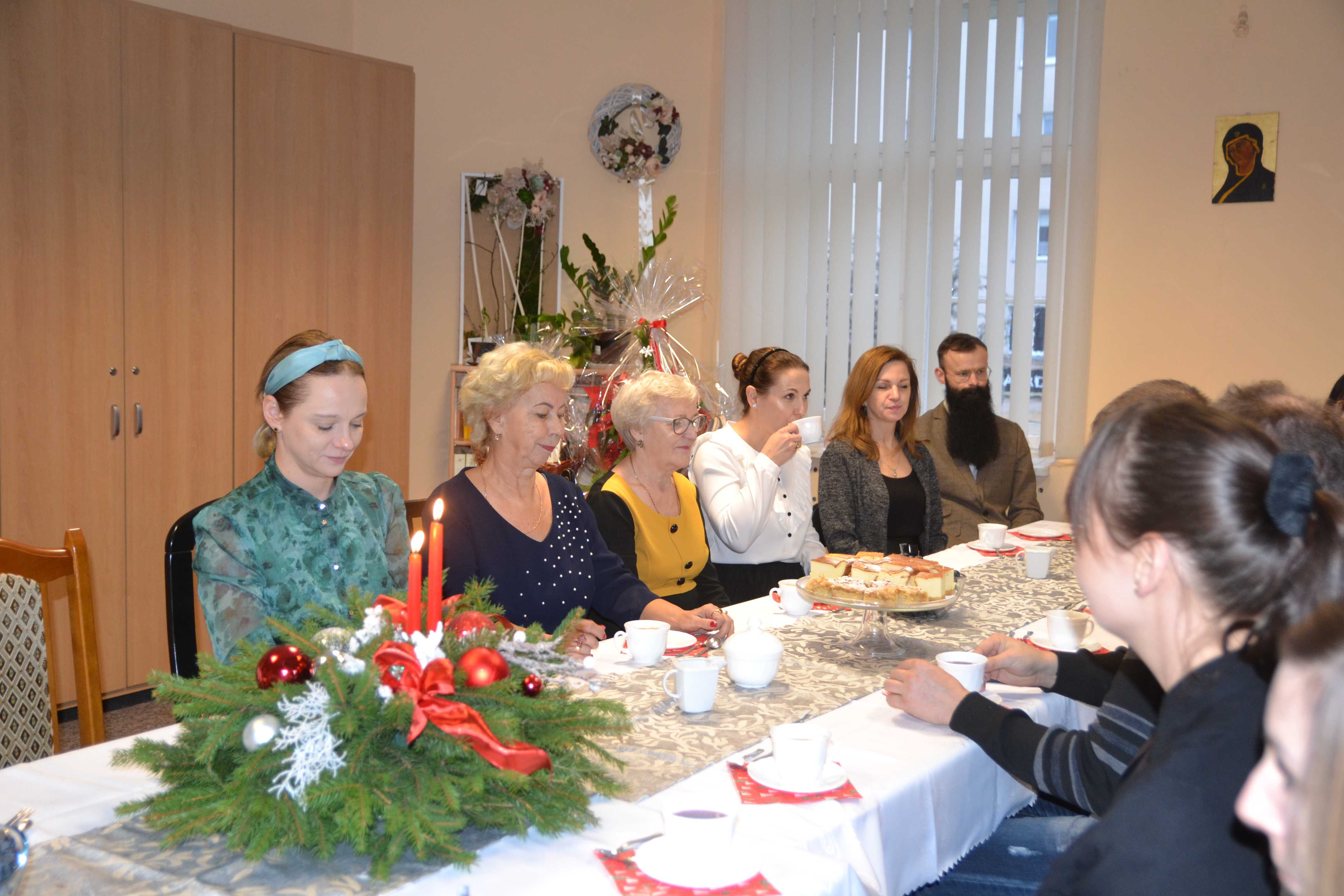Nie mogło zabraknąć również wspólnego kolędowania przy akompaniamencie kibordu. Kolejnym punktem uroczystości było wspólne spożycie przygotowanych na tę okoliczność potraw. Każdy z gości otrzymał bożonarodzeniowy stroik na pamiątkę wizyty w naszym Domu, zaś uczestnicy tradycyjnie zostali obdarowani paczkami.