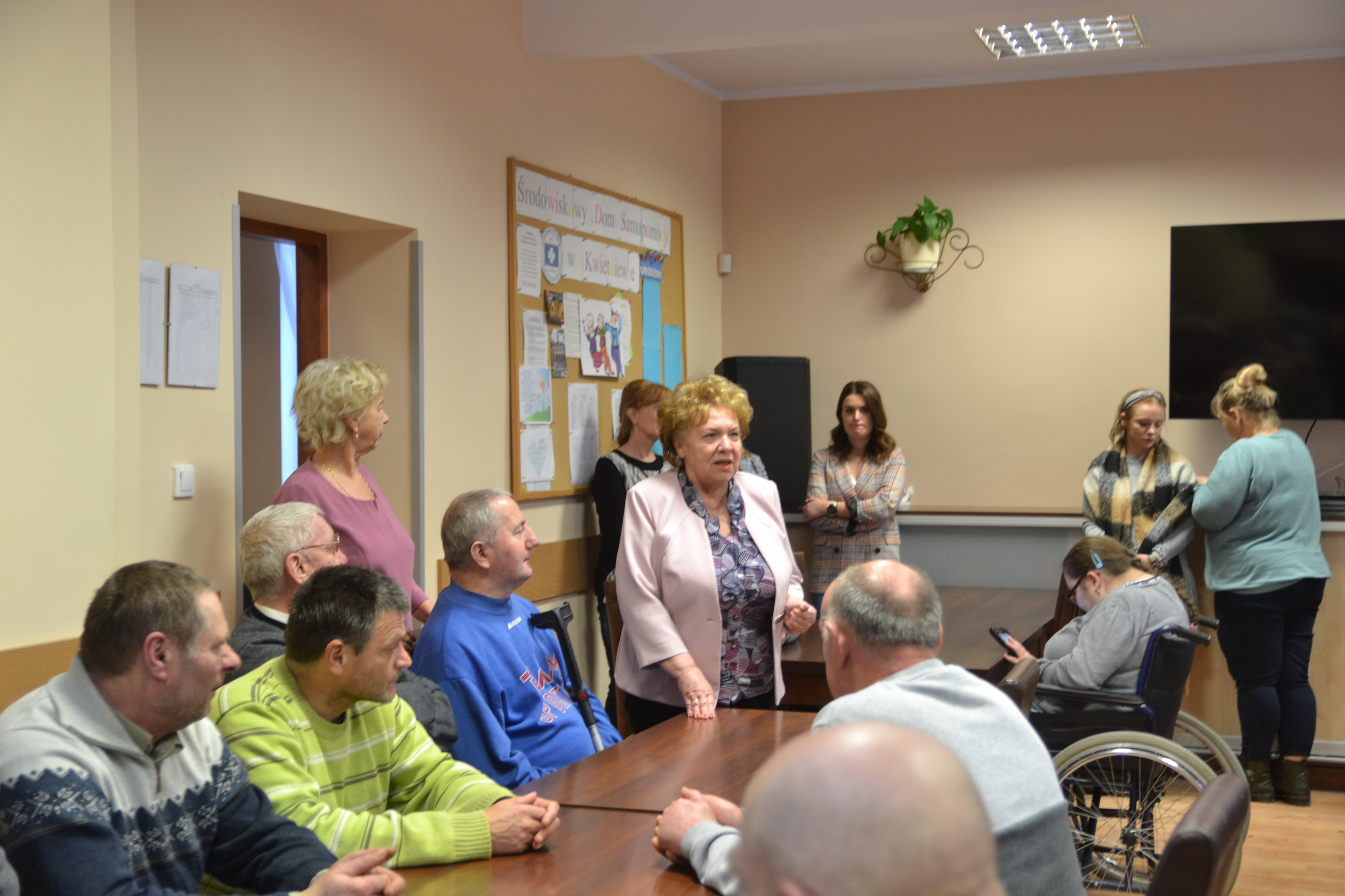 Pani Prezes zwróciła się do uczestników, składając noworoczne życzenia i życząc satysfakcji i radości zarówno z uczestnictwa w zajęciach Środowiskowego Domu Samopomocy w Kwietniewie, jak i w życiu prywatnym. Nie mogło zabraknąć rozmowy o radosnym wydarzeniu, jakim było pozyskanie przez Elbląskie Stowarzyszenie Organizatorów Pomocy Społecznej nowego samochodu do przewozu osób niepełnosprawnych.