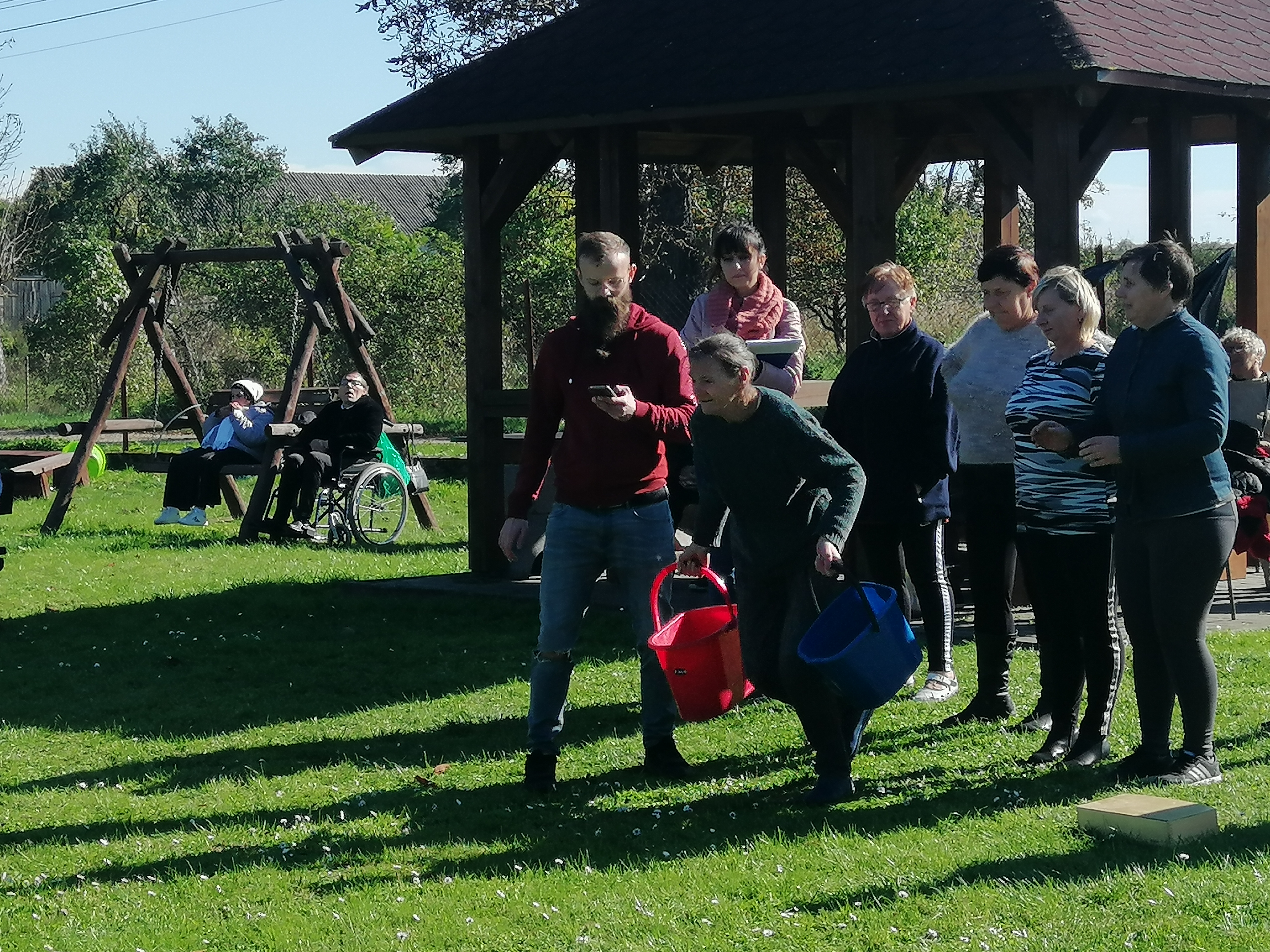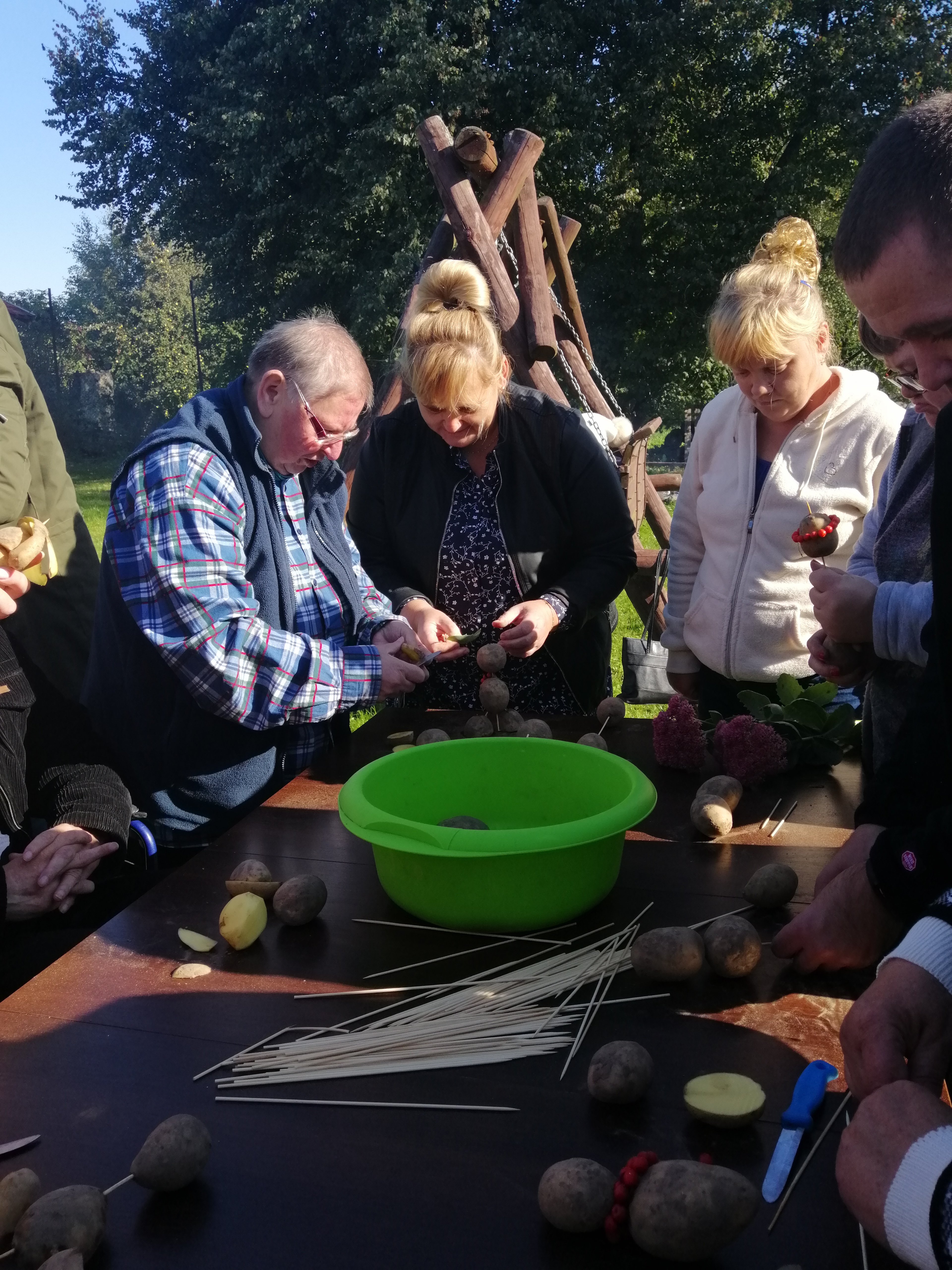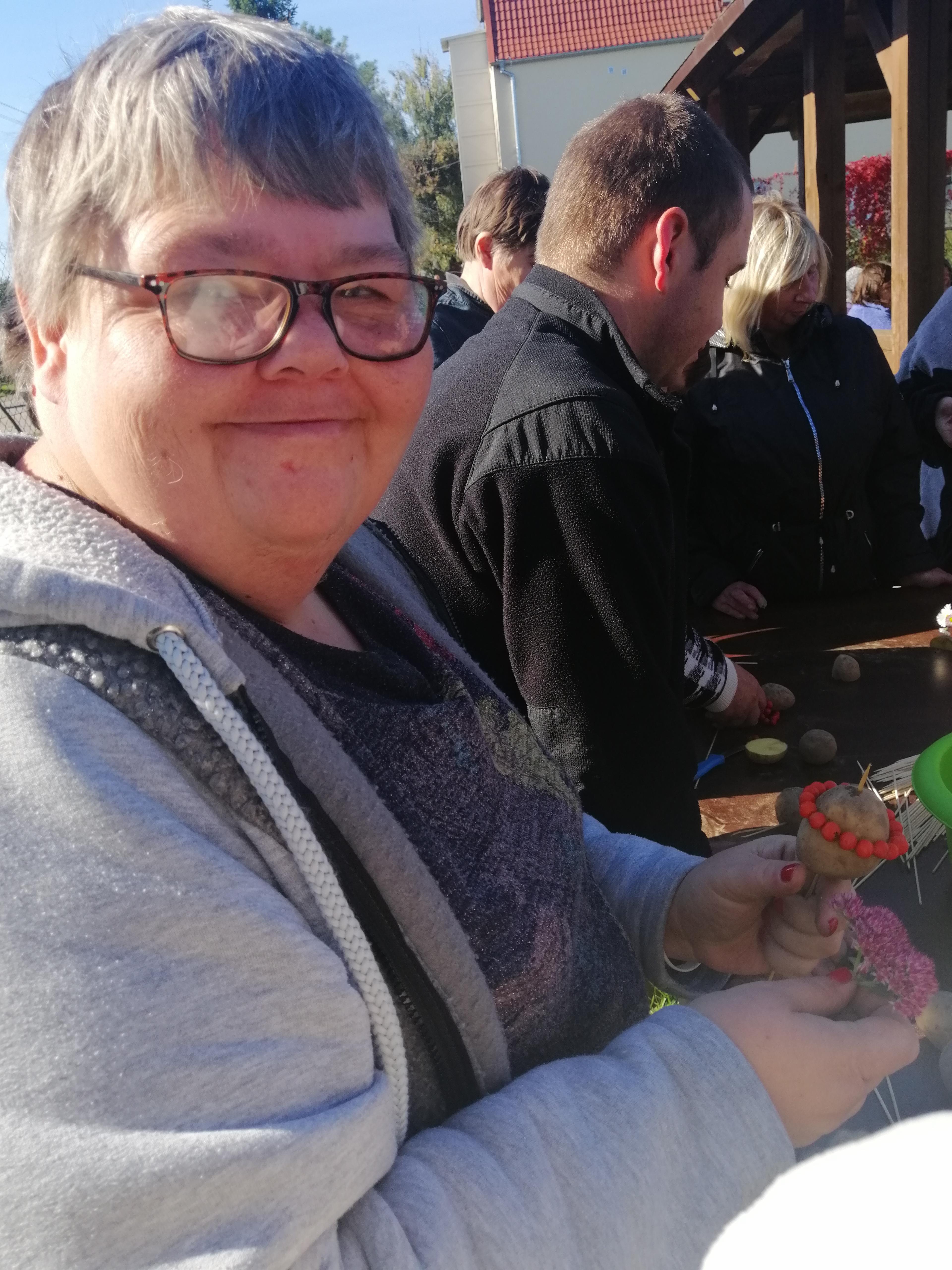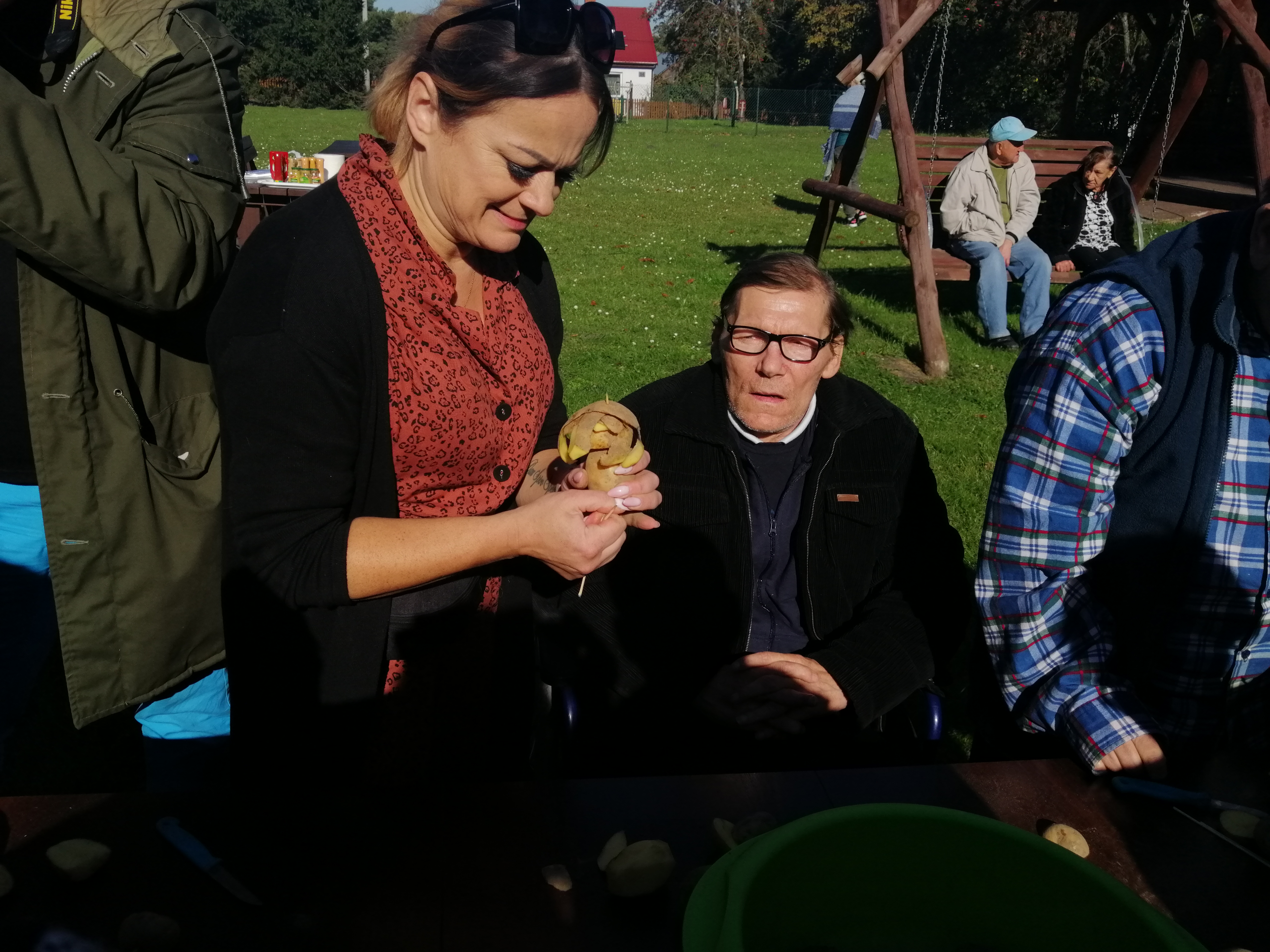 Tradycyjnie na polskiej wsi z okazji zakończenia wykopków organizuje się zabawy, podczas których króluje ziemniak. Nasi uczestnicy z niezmienną radością i zaangażowaniem włączyli się w tę tradycję również w tym roku i z tej okazji 1 października zorganizowaliśmy na naszym boisku ognisko, a z głośników rozbrzmiewała muzyka, zapraszając wszystkich do wspólnej zabawy. Tego dnia nie mogło zabraknąć także lubianych przez naszych podopiecznych konkursów tematycznych. Osoby chętne do aktywizacji ruchowej mogły wziąć udział w przygotowanych przez kadrę zabawach- konkurs na najdłuższą ziemniaczaną obierkę, rzut ziemniakiem do garnka, bieg z wiadrami, wykonanie ziemniaczanej figurki. Nie mogło zabraknąć również testu wiedzy o naszym głównym bohaterze- ziemniaku, z którego można było dowiedzieć się kilku ciekawostek dotyczących tego właśnie warzywa. W przerwach czas umilaliśmy sobie wspólnym śpiewem i tańcem. Zwieńczeniem spotkania było wspólne biesiadowanie przy kiełbasce z grilla i potrawach z ziemniakiem w roli głównej- babka ziemniaczana, sałatka z ziemniaków oraz pieczony ziemniak z ogniska.