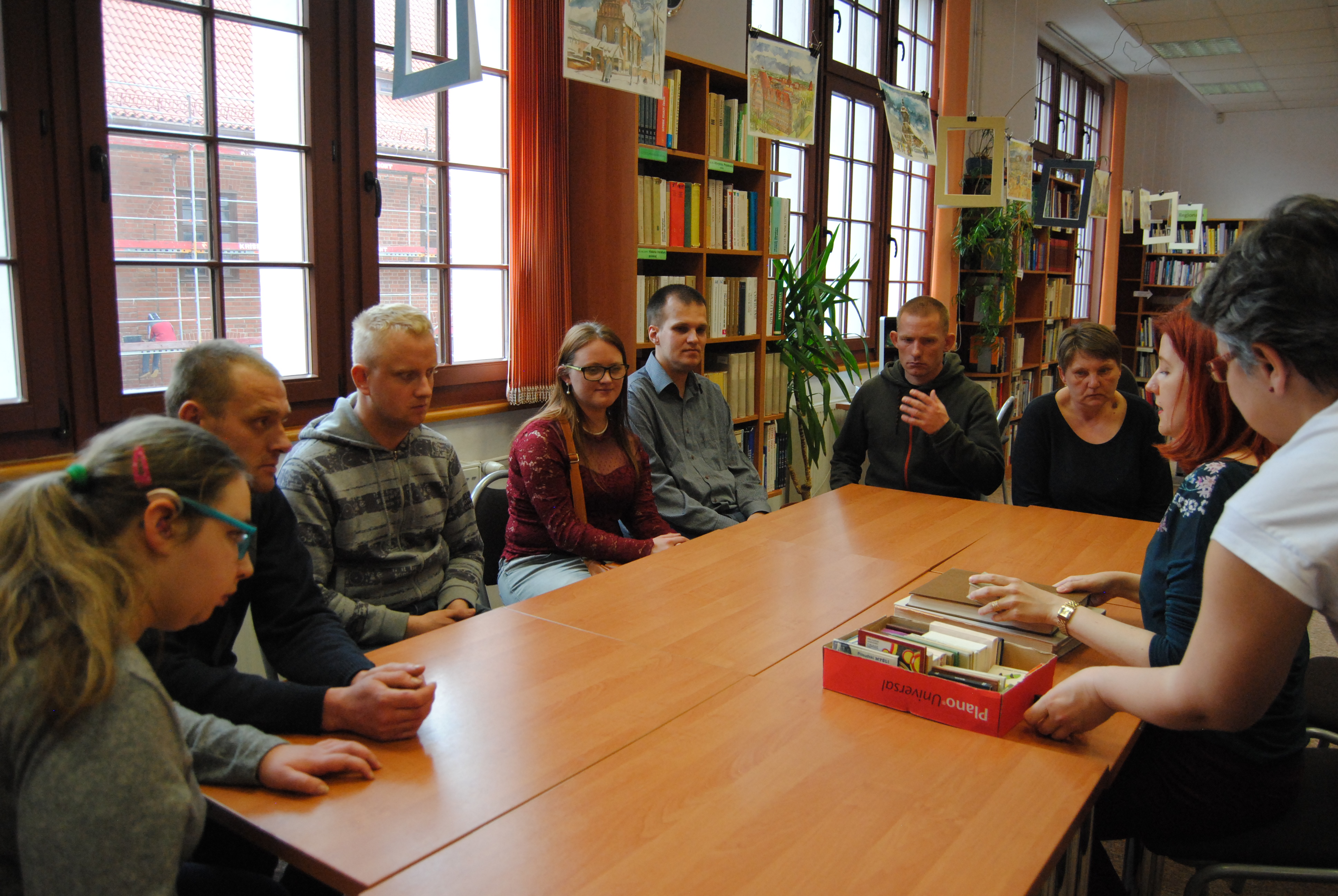 Uczestnicy zostali bardzo miło przywitani przez panie bibliotekarki, które w interesujący sposób przedstawiły nam funkcjonowanie biblioteki. Spotkanie miało charakter interdyscyplinarny, omawiano działy biblioteczne, przeplatając opowieści bogato ilustrowanymi książkami. Uczestnicy dzielili się posiadanymi wiadomościami oraz z zainteresowaniem słuchali opowiadań bibliotekarek. Zwiedziliśmy dział czasopism, dział książek historycznych oraz czytelnię pedagogiczną. Najwięcej emocji dostarczyła miniaturowa książka o wymiarach 1 cm x 1 cm, w której znajduje się modlitwa „Ojcze Nasz” w 6 językach świata. Na koniec uczestnicy wykonali własnoręcznie zakładki do książek. W prezencie otrzymaliśmy malownicze puzzle nawiązujące do twórczości Gustava Klimt’a oraz Melozzo da Forli. Uczestnicy będą kontynuować swoją podróż czytelniczą, bowiem 21 marca ponownie wybieramy się na zajęcia edukacyjne do Warmińsko-Mazurskiej Biblioteki Pedagogicznej w Elblągu.