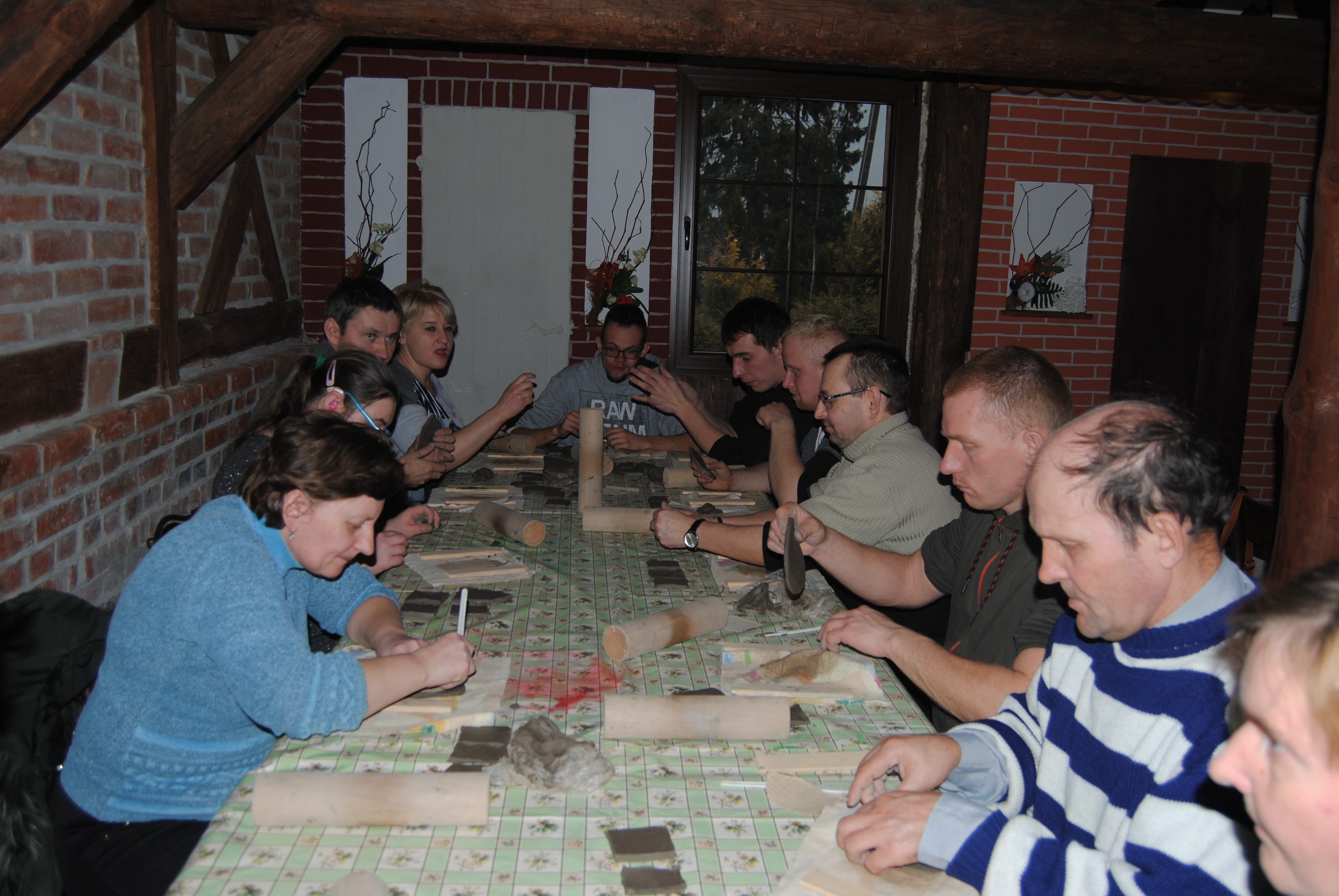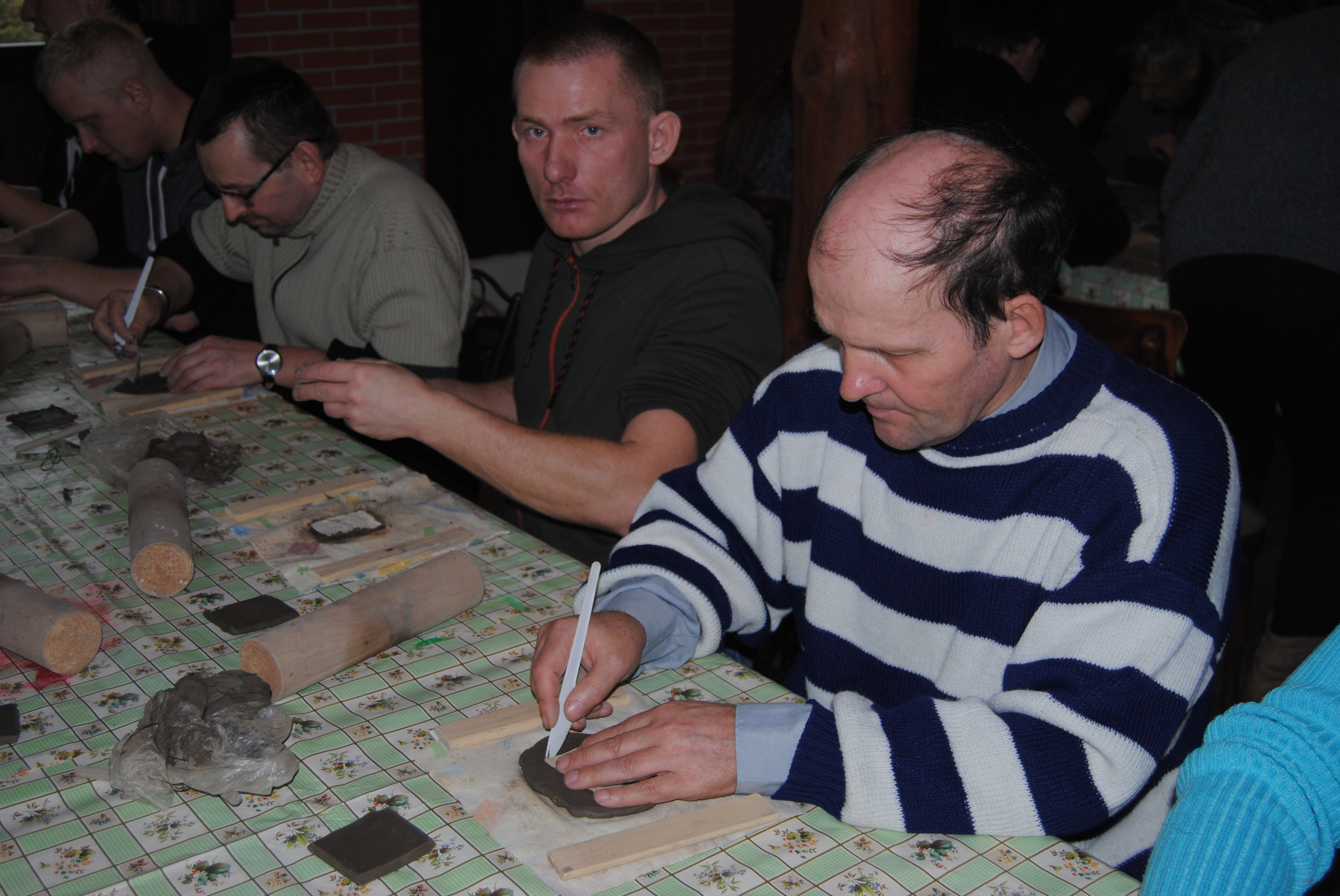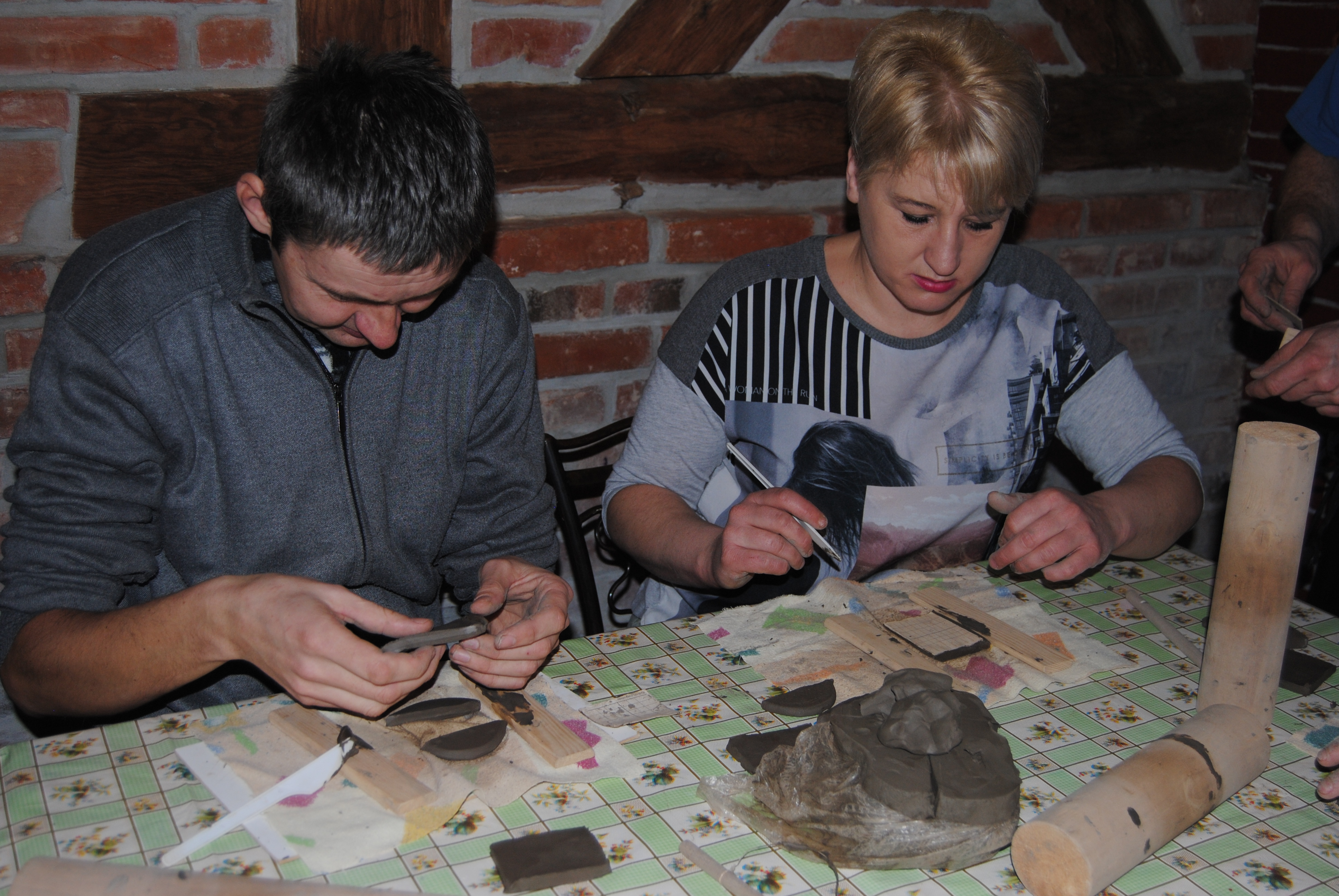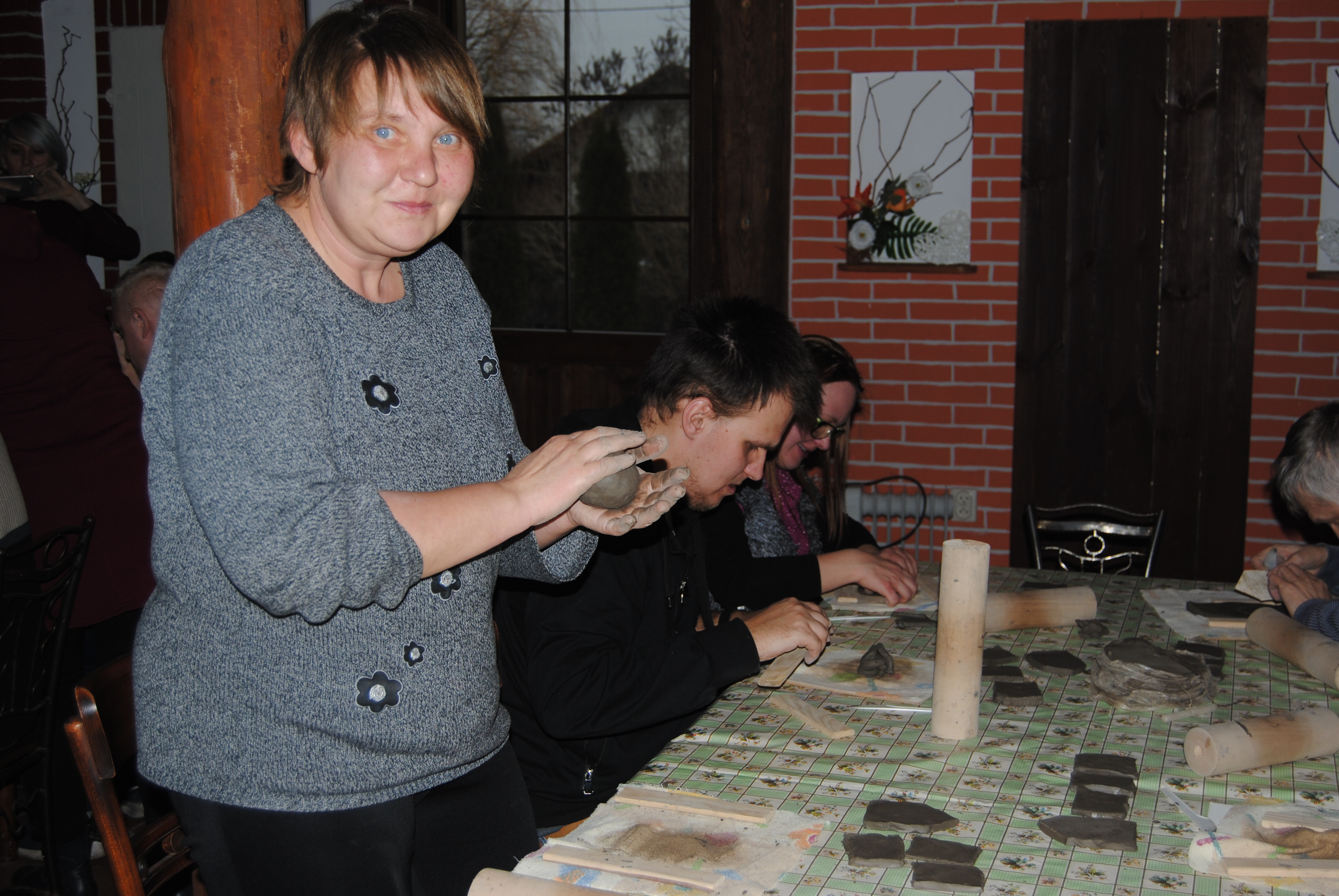 W dniu 11.02.2019 roku uczestnicy Środowiskowego Domu Samopomocy w Jegłowniku, w tym podopieczni z niepełnosprawnością sprzężoną brali udział w warsztatach garncarskich organizowanych na terenie zagrody edukacyjnej „Ziołowy dzbanek” w miejscowości Sąpy. Zajęcia związane z wyrabianiem gliny pełnią niezwykle istotną rolę w terapii osób niepełnosprawnych, a w szczególności z zaburzoną motoryką. Praca z gliną, ugniatanie jej, lepienie pobudzają aktywność, mobilizują do wysiłku nie tylko fizycznego, ale także umysłowego. Dla osób z niepełnosprawnością sprzężoną bardzo ważna jest funkcja terapeutyczna zajęć. Wyrabianie gliny pobudza pracę mięśni, które nie są aktywne przy żadnym innym rodzaju ruchu. Ponadto wyrabianie gliny pobudza receptory nerwowe w skórze, ćwiczy słabą koordynację wzrokowo-ruchową. Dodatkową motywacją podejmowania działań przez uczestników jest efekt pracy w postaci gotowego wyrobu. Podczas zajęć uczestnicy mieli szansę ulepić gliniany domek, który jednocześnie będzie mógł pełnić funkcję klimatycznego świecznika. Uczestnicy pełni zaangażowania i dbałości o detale pod okiem instruktora wykonywali poszczególne etapy prac rękodzielniczych.
