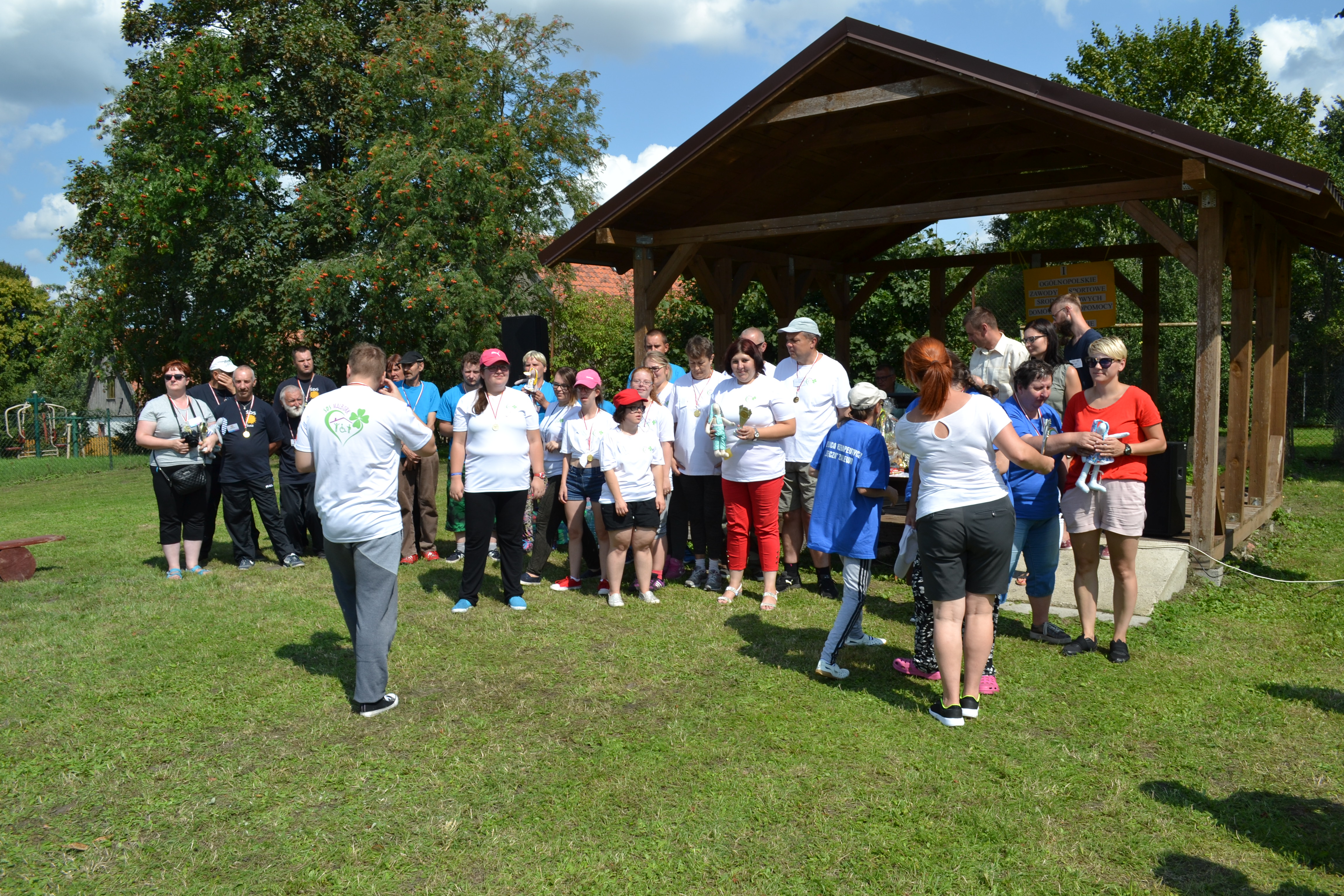 Dnia 17 sierpnia 2018 r. w Środowiskowym Domu Samopomocy w Kwietniewie odbyły się I OGÓLNOPOLSKIE ZAWODY SPORTOWE ŚRODOWISKOWYCH DOMÓW SAMOPOMOCY W KWIETNIEWIE. W wydarzeniu wzięło udział pięć drużyn: ŚDS z Susza, ŚDS z Przezmarka, ŚDS z Malborka, Świetlica Socjoterapeutyczna z Zalewa oraz ŚDS z Kwietniewa. Na początku nasz dom zaprezentował występ muzyczny przygotowany przez Pana Piotra Bindera, Terapeutę. Pani Alicja Kryłow, Pani Małgorzata Kowalczyk, Pan Jarosław Baran zaśpiewali pięć utworów, między innymi: „ Marianna” oraz „ Cyganeczka Zosia”. Gromkimi brawami zostali nagrodzeni nasi uczestnicy. Po występie artystycznym przystąpiliśmy do konkurencji. Zawodnicy wzięli udział w przeciąganiu liny, wskokach w workach, bieg z jajkiem, bieg z wiaderkiem oraz wyścig rydwanów. Ostatnia konkurencja przyniosła wiele radości oraz integrację Terapeutów i uczestników. Po zakończeniu części sportowej jury podliczało zebrane punkty, zaś uczestnicy bawili się przy dźwiękach muzyki. Następnie wszystkie osoby obecne na zawodach mogły posilić się przy wspólnym grillowaniu. W I OGÓLNOPOLSKICH ZAWODACH SPORTOWYCH ŚRODOWISKOWYCH DOMÓW SAMOPOMOCY W KWIETNIEWIE I miejsce zajął ŚDS z Susza, II miejsce otrzymali ŚDS z Przezmarka, zaś III miejsce ŚDS z Kwietniewa. Każdy uczestnik za duch walki oraz zdrową rywalizację otrzymał medal. Dzięki tym zawodom uczestnicy mogli nauczyć się umiejętności organizacji zespołu, „zdrowej rywalizacji” i zaangażowania. Kolejny raz można było zauważyć jak sport może łączyć ludzi.