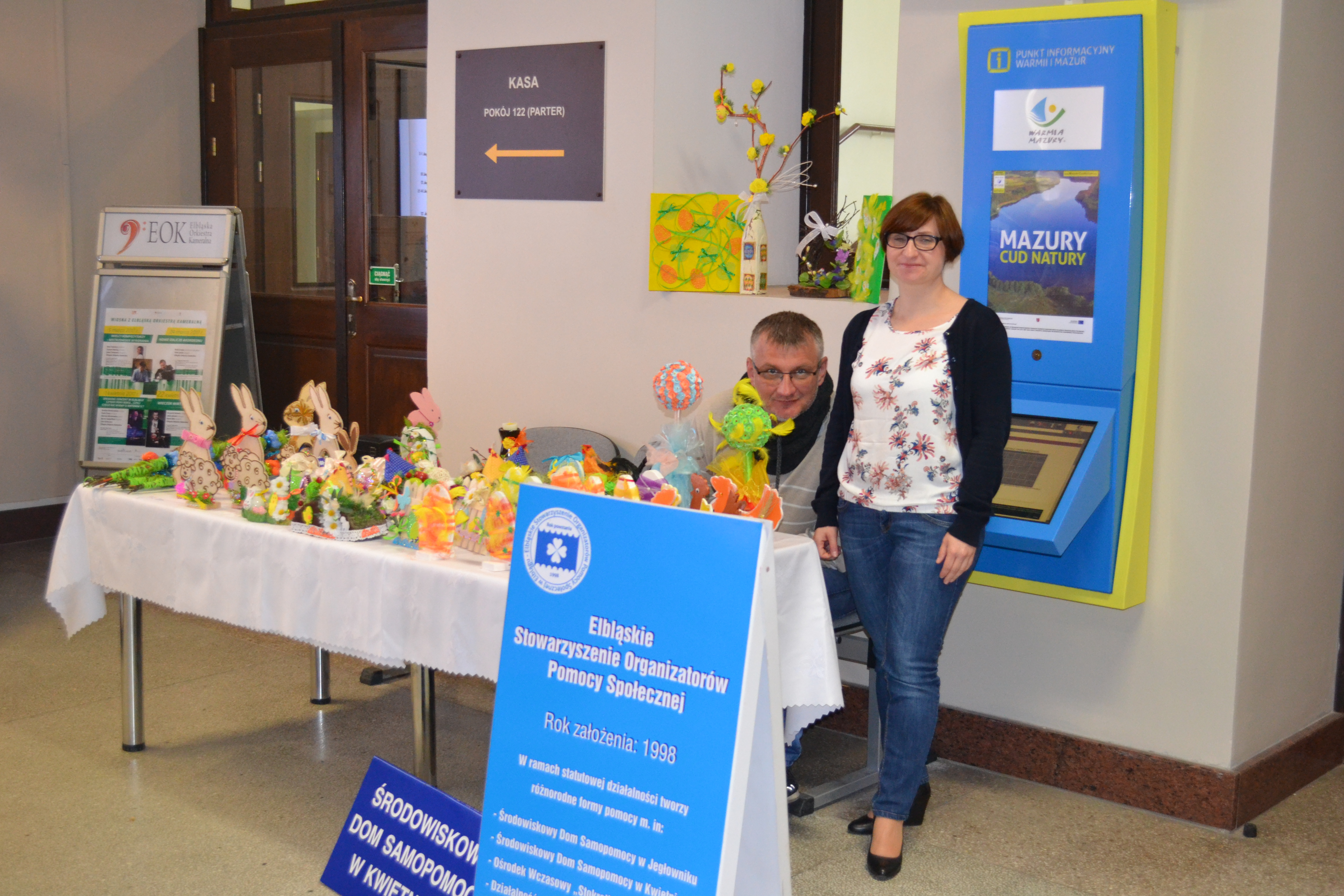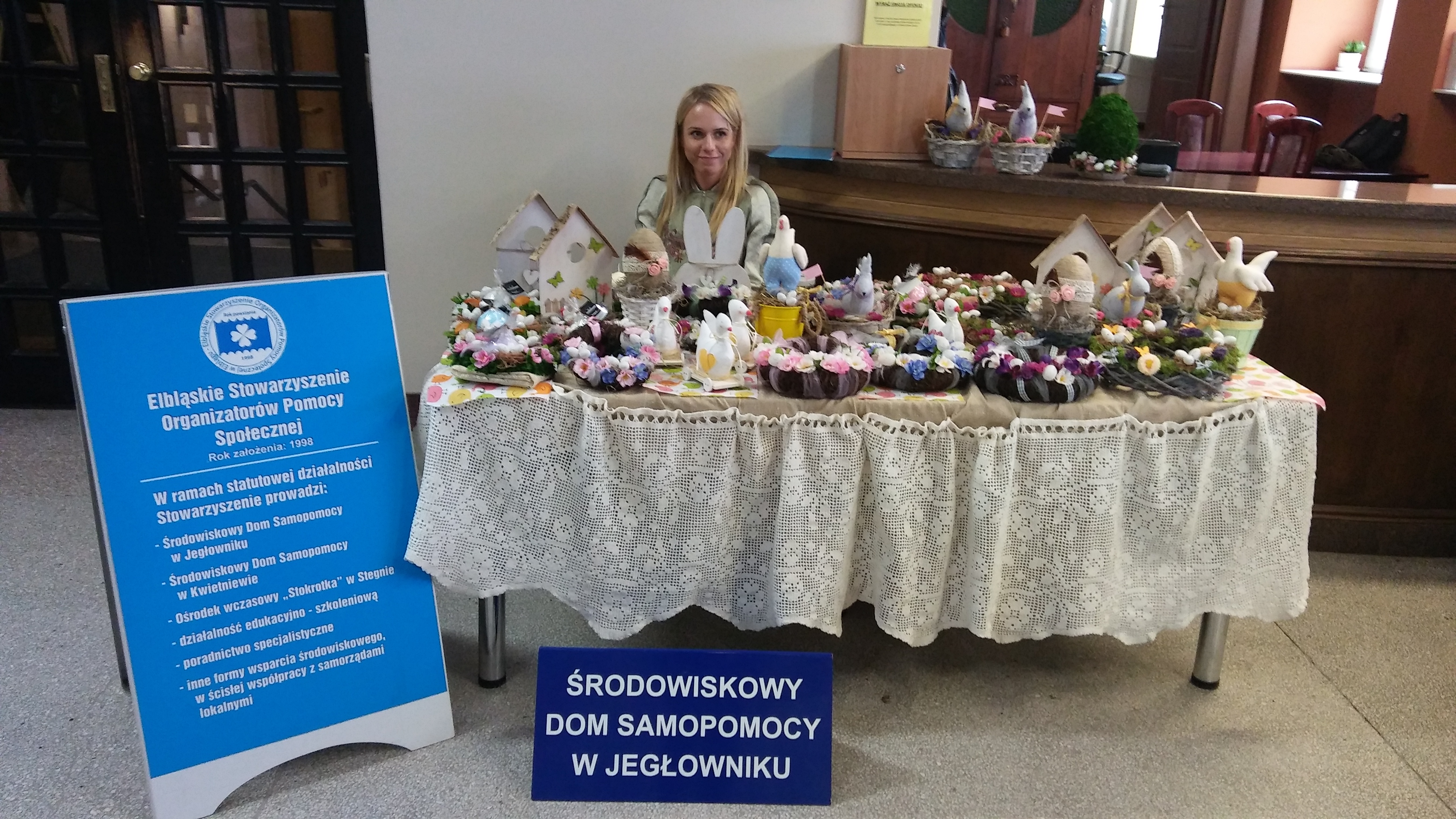W dniach 31 marca oraz 3 kwietnia 2017 r. w Urzędzie Miasta w Elblągu odbył się Kiermasz Wielkanocny zorganizowany przez Elbląskie Stowarzyszenie Organizatorów Pomocy Społecznej. Podczas kiermaszu zaprezentowano prace oraz dekoracje świąteczne przygotowane w ramach terapii zajęciowej przez uczestników Środowiskowych Domów Samopomocy w Jegłowniku oraz Kwietniewie. Chętni mogli nabyć palmy wielkanocne, dekoracje z drewna, szyte kury, baranki, zające, zdobione sznurem jaja, wieńce oraz stroiki wielkanocne na stół, i wiele, wiele innych.