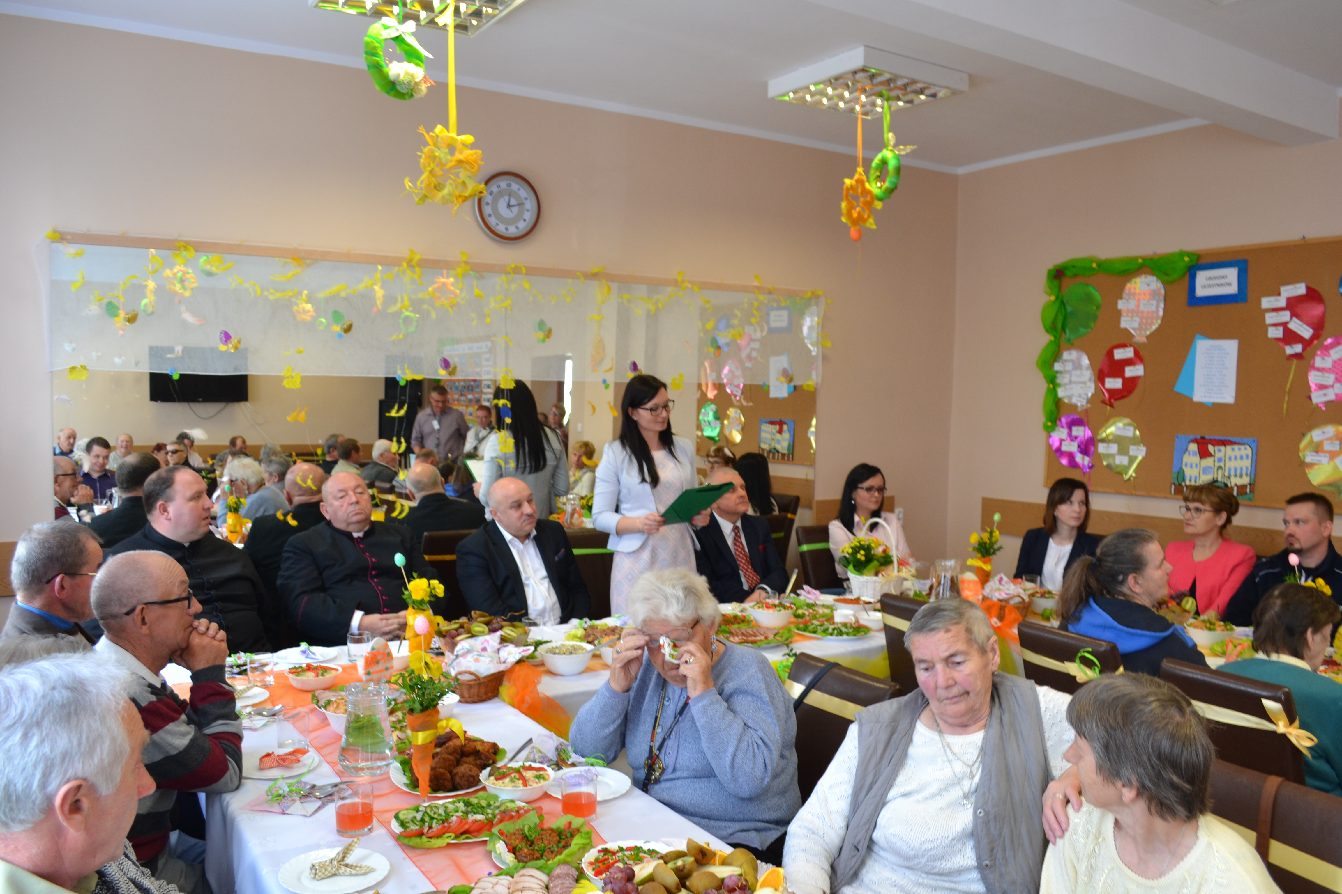 Wszystkich gości zebranych przy stołach zastawionych wielkanocnymi delicjami powitała Kierownik ŚDS w Kwietniewie p. Patrycja Rama i złożyła zebranym świąteczne życzenia, także w imieniu Pani Prezes Anny Szyszki, która z powodów zdrowotnych nie mogła być obecna na naszej uroczystości Następnie p. Jarosław Kogut – Wiceprezes ESOPS, p. Wiesław Śniecikowski – Burmistrz Pasłęka, p. Agnieszka Jundziłł – przedstawiciel Urzędu Gminy w Rychlikach i ks. Lech Wasilewski wygłosili krótkie przemówienia, które oprócz życzeń świątecznych zawierały gratulacje dla Pani kierownik, kadry i uczestników za całokształt działalności naszego Domu.